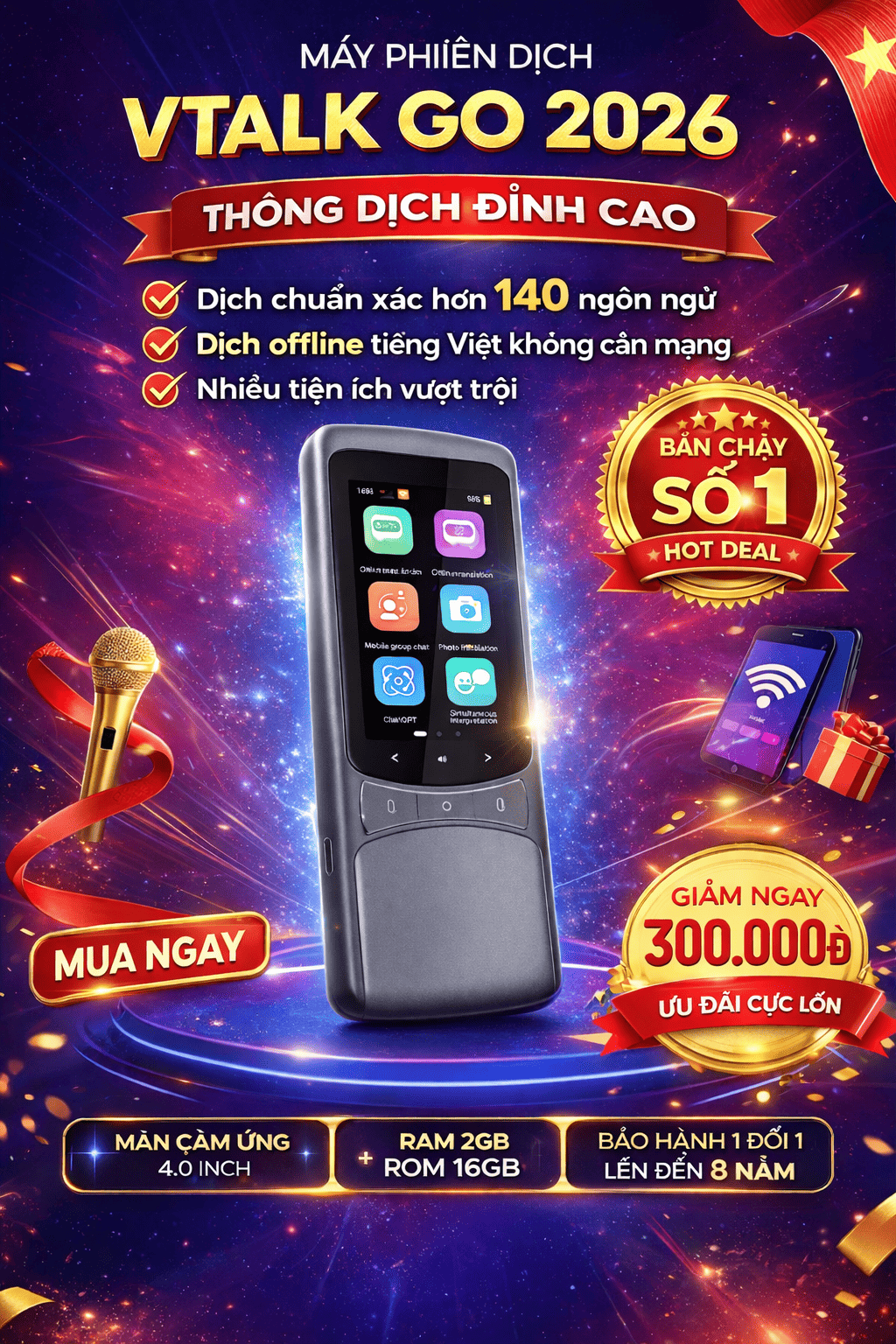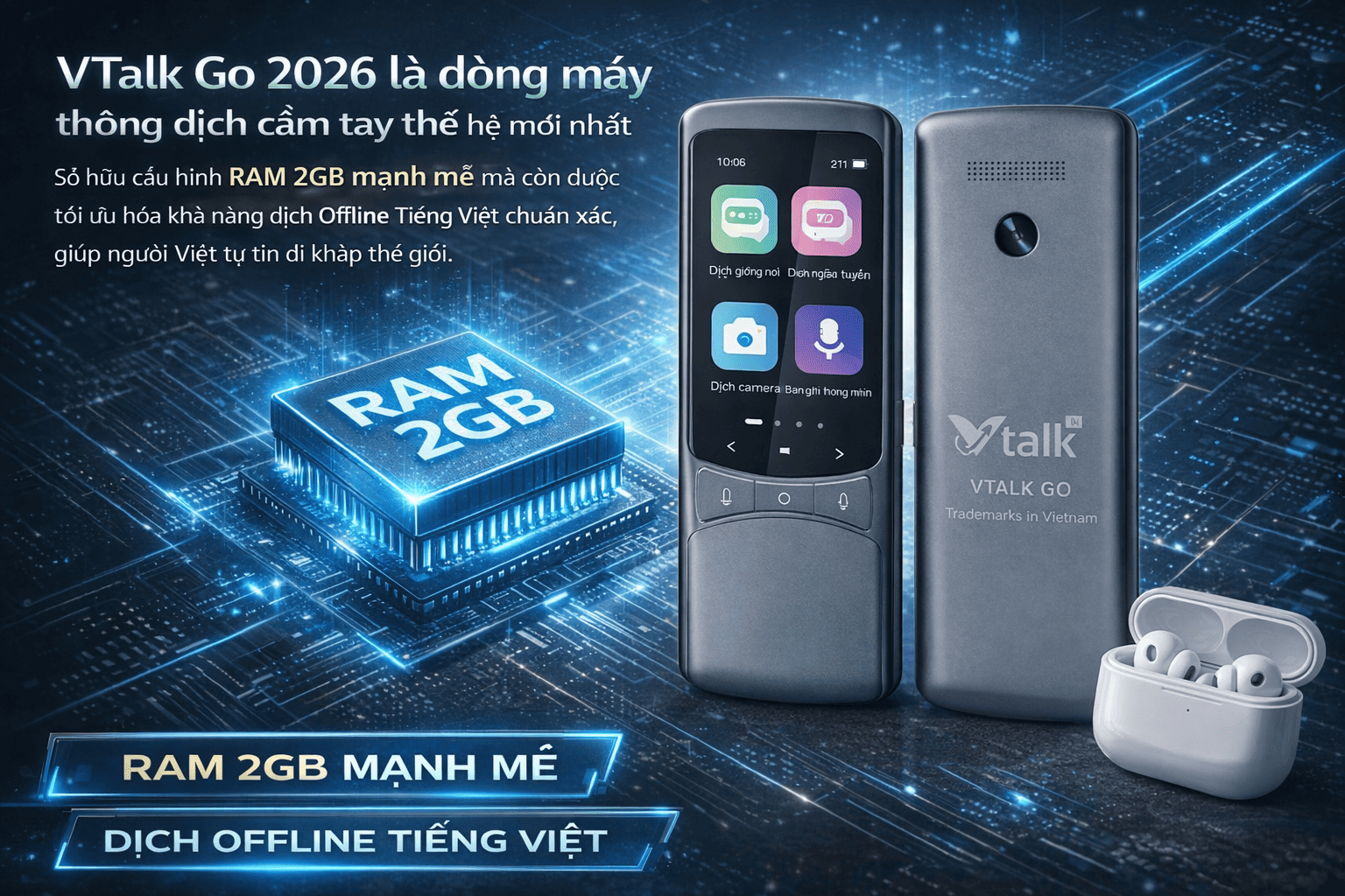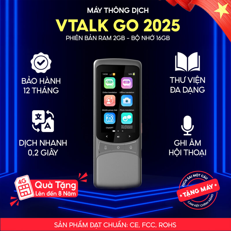 VTalk Go 2026 là dòng máy thông dịch cầm tay thế hệ mới nhất, sở hữu cấu hình RAM 2GB mạnh mẽ mà còn được tối ưu hóa khả năng dịch Offline Tiếng Việt chuẩn xác, giúp người Việt tự tin đi khắp thế giới.