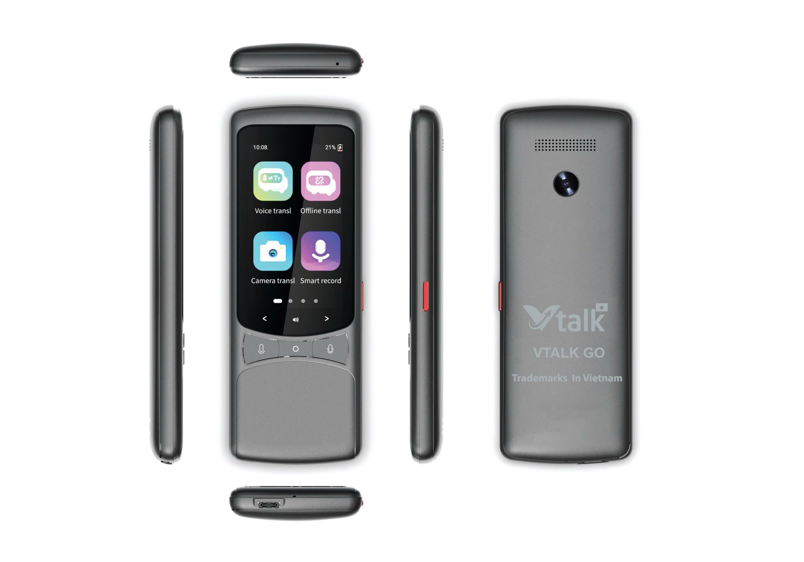 Máy phiên dịch Vtalk Go Pro là sản phẩm mang thương hiệu Việt Nam, là mẫu độc quyền duy nhất thị trường đáp ứng nhu cầu phiên dịch tiếng Việt ngay cả khi không có kết nối mạng (dịch offline) và tích hợp eSIM dùng trên toàn thế giới mà không cần lắp sim hoặc kết nối wifi.
